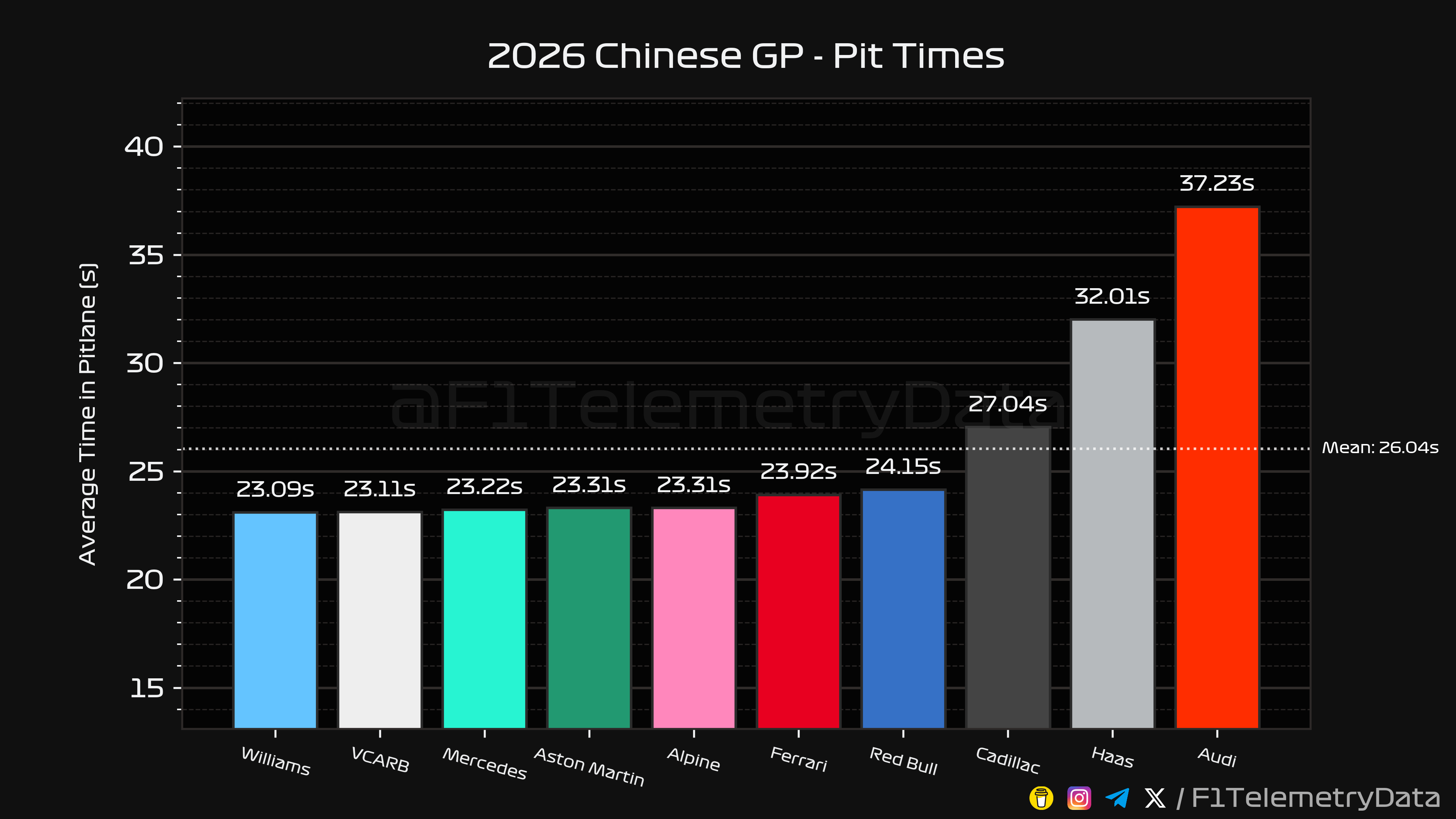 Two races into Formula 1’s new regulatory era and pit lane performance already shows how quickly teams are adapting to the demands of the redesigned 2026 cars. At Shanghai, Williams topped the pit lane charts with an average of 23.09 seconds, a strong operational display for a team revitalised by Carlos Sainz’s arrival and a more competitive package. VCARB and Mercedes followed closely, both just over the 23-second mark, suggesting their crews have adapted well to the slightly heavier wheel assemblies and revised brake cooling systems introduced under the new technical rules. Aston Martin and Alpine sat within a tenth of that group, indicating that most teams are converging around a similar operational benchmark as they refine pit procedures for the new cars. Ferrari and Red Bull were slightly slower than expected, around 24 seconds, which may reflect ongoing adjustments to tyre temperature management and updated suspension layouts that influence how the car settles during a stop. The most notable struggles came from the sport’s new entrants: Cadillac averaged 27.04 seconds, while Audi recorded a substantial 37.23 seconds, highlighting the steep learning curve facing manufacturers entering Formula 1 under a fresh rule cycle. With the mean pit time sitting at 26.04 seconds, the data suggests the front half of the grid has already stabilised its procedures, while newer operations are still working through the complexities of the revised pit equipment and car architecture.