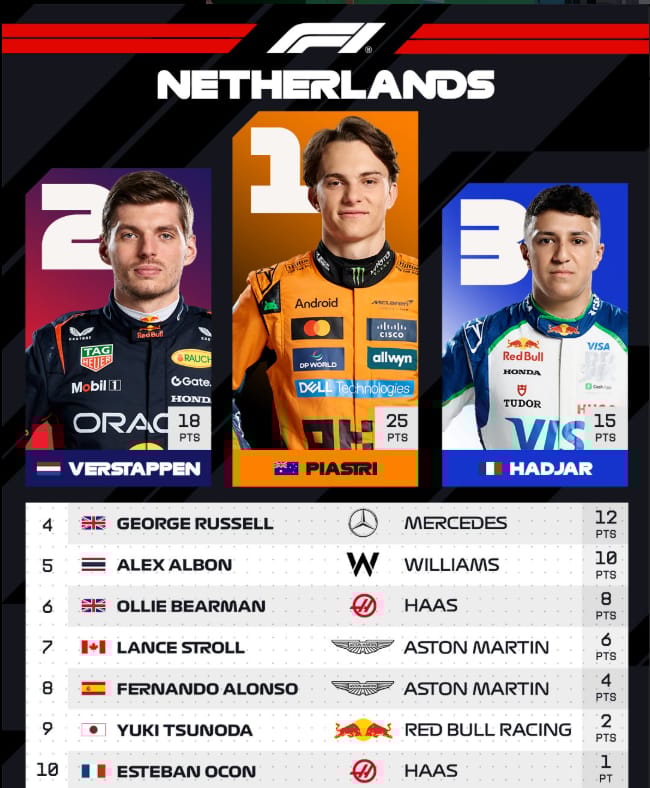When the dust settled, Piastri stood alone on the top step, his perfect performance contrasted by the cruel fate of Lando Norris, who retired late with a mechanical failure. Max Verstappen delighted the home crowd with second, while rookie Isack Hadjar’s maiden podium lit up the paddock. Ferrari endured a miserable afternoon with no points, Mercedes and Williams quietly banked valuable finishes, and McLaren left Zandvoort with mixed emotions. The outcome widened Piastri’s lead in the Drivers’ Championship and put McLaren firmly in control of the Constructors’, leaving the rest of the grid scrambling to respond as the season heads into its decisive phase.