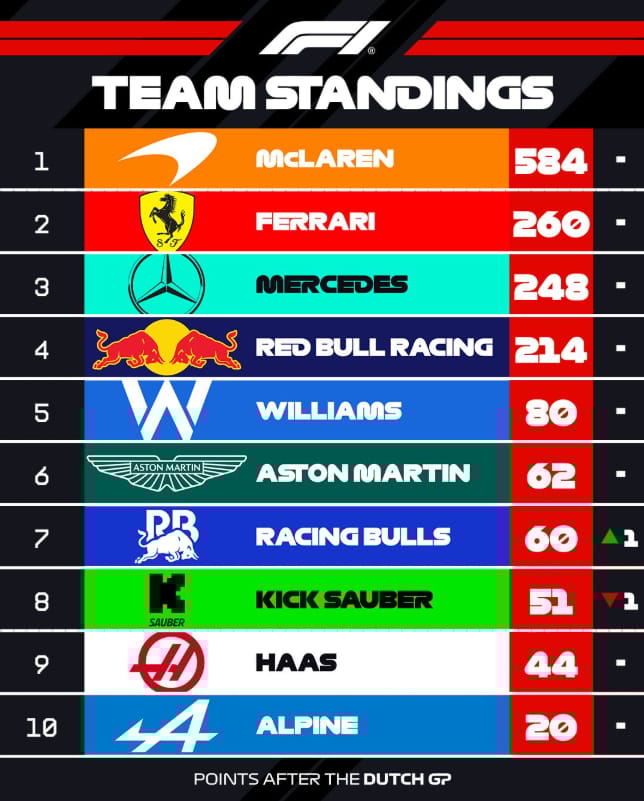 McLaren now lead the Constructors’ Championship with 584 points, Ferrari sit second at 260, and Mercedes third with 248. Red Bull, despite Verstappen’s podium, remain down in fourth with 214. With Piastri leading at 309 points and Norris at 275, the McLaren driver duo dominate the standings Max Verstappen follows at 205.