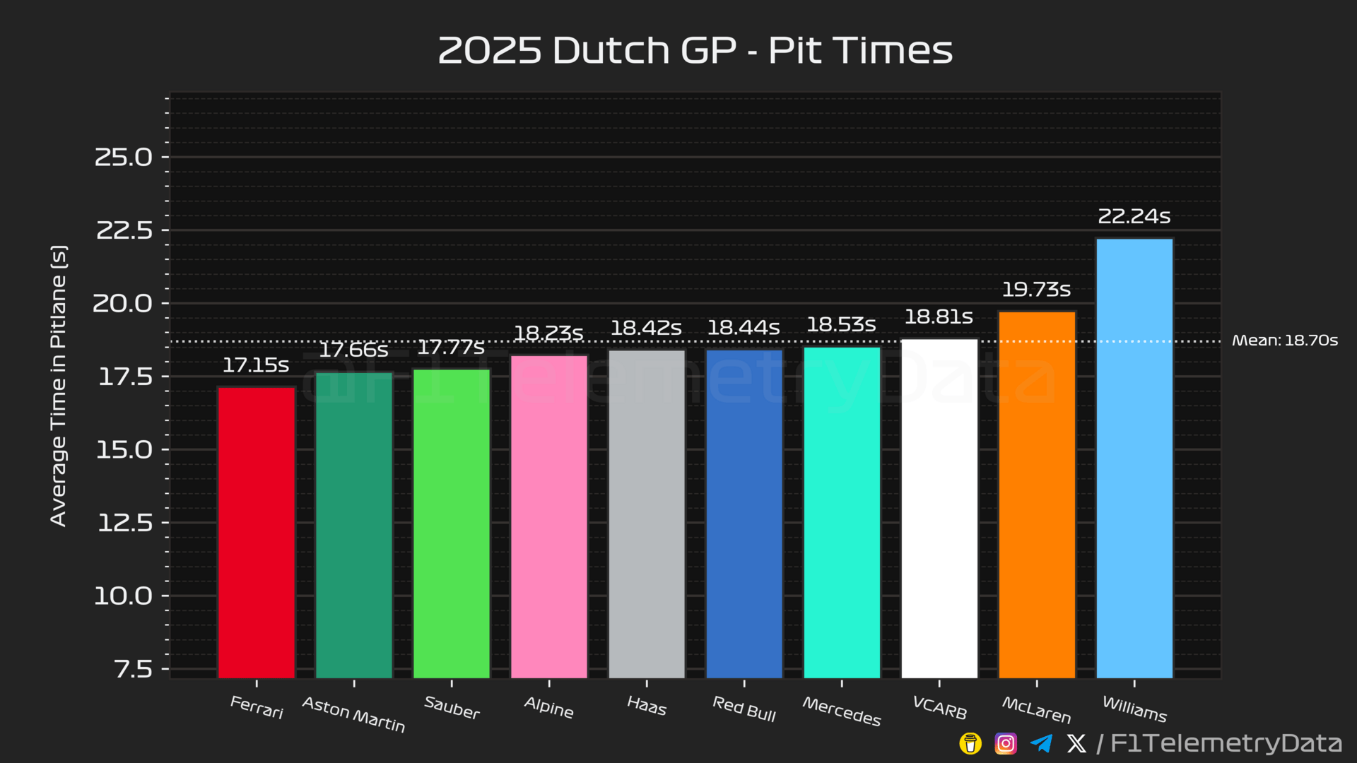 The pit lane statistics from Zandvoort highlight a real spread in efficiency between teams. Ferrari came out on top with an average of 17.15 seconds, comfortably quicker than the field and nearly a full second ahead of Mercedes. Aston Martin and Sauber were also tidy, both staying under 17.8 seconds. At the other end, Williams had a nightmare, averaging 22.24 seconds, almost five seconds slower than Ferrari. McLaren, too, were notably sluggish with an average of 19.73 seconds, which only added to Lando Norris’s frustration when reliability issues ended his race. Across the grid, the mean sat at 18.70 seconds, meaning Ferrari and Aston Martin can be proud of their slick work, while Williams must face questions about costly time haemorrhaged in the pits.