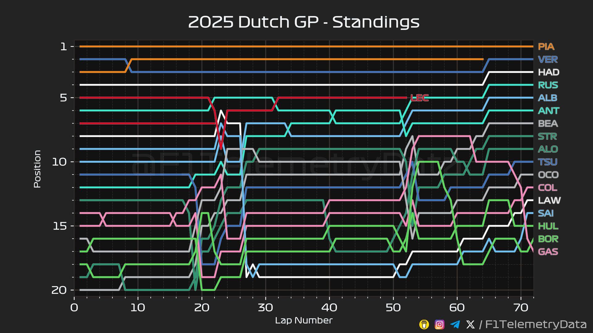 The lap by lap standings paint the story of control, chaos, and heartbreak. Oscar Piastri’s line across the top is a picture of dominance, once he led from the start, he never relinquished control. Max Verstappen briefly shuffled early but soon locked into second, carrying the home crowd’s hopes. Isack Hadjar’s steady climb into third and holding position is the standout, underlining a calm maturity in his first podium finish. Further down, the chart shows the volatility of the midfield, with Alexander Albon and George Russell fighting tooth and nail, while Ferrari’s Charles Leclerc (LEC) plunged from the top five into retirement, his red line abruptly cutting off. It’s a visual confirmation of a race that was Piastri’s to command, Verstappen’s to consolidate, and Hadjar’s to announce himself on the big stage.