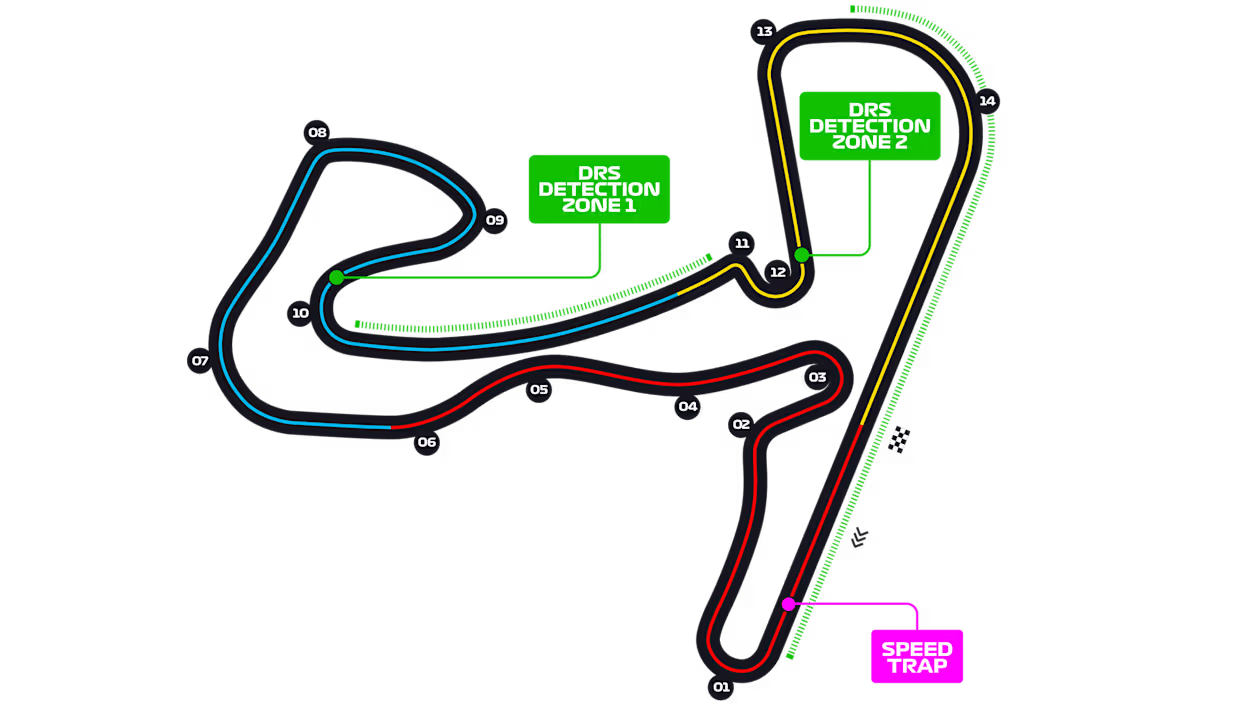 Key Features: Banked corners (Turn 3 & Turn 14), flowing mid sector, limited overtaking opportunities