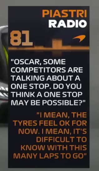 By lap 9, Leclerc had carved out a solid lead of 2.8 seconds, opening the door to strategic discussions, particularly around tyre longevity. Piastri, shadowing in second, questioned the viability of a one-stop strategy early on, seemingly uncertain. That hesitation would come back to haunt him. By lap 25, still weighing up the plan, he asked again about the one-stopper, but by then the challenge was already steep.