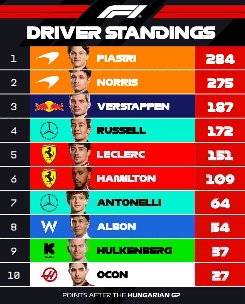 It’s McLaren who march into the summer break with momentum firmly in hand. Piastri may still lead in the standings, but after this commanding drive, it’s Norris who’s riding the wave.