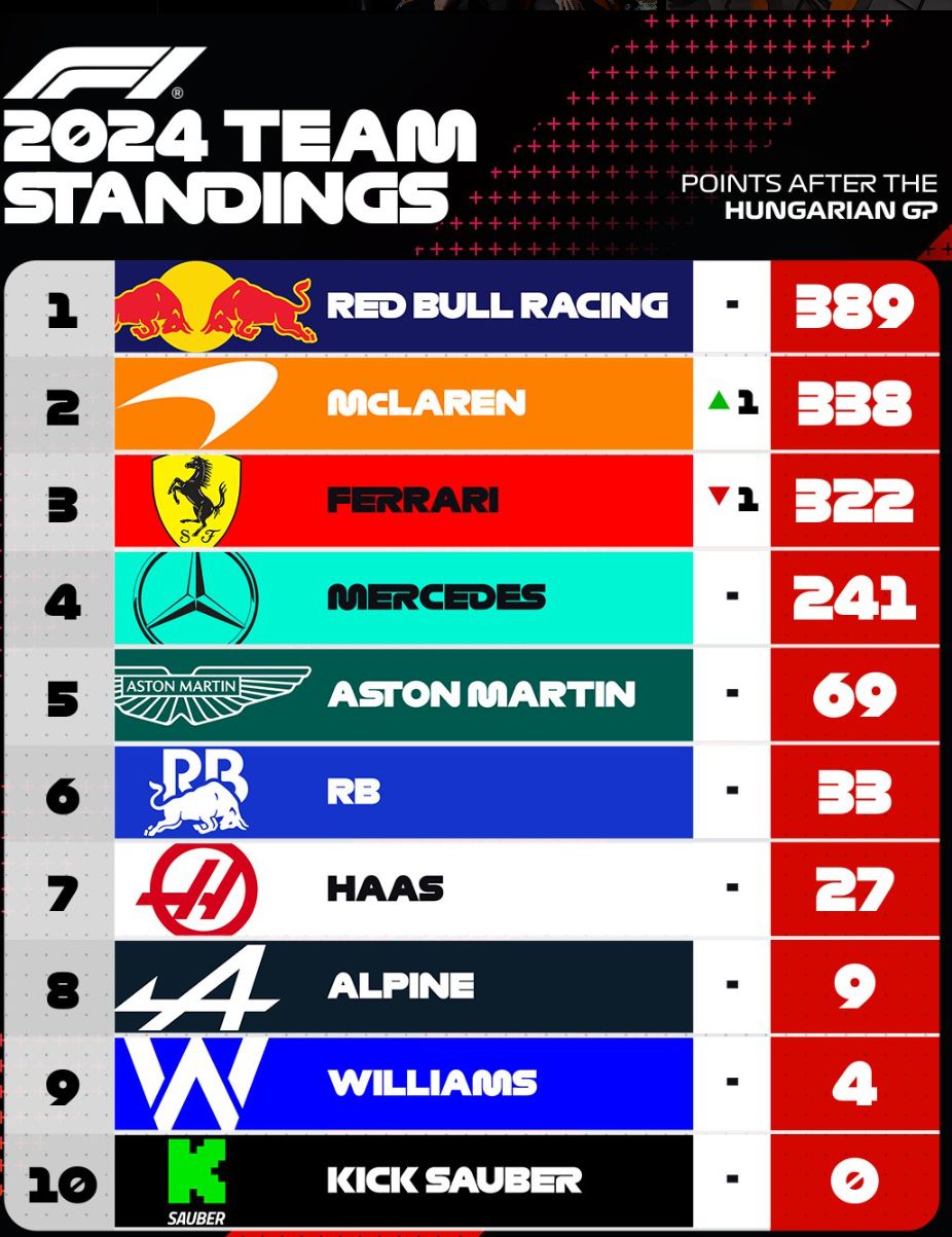 Constructors Standings After Hungarian GP - Red bull Lead