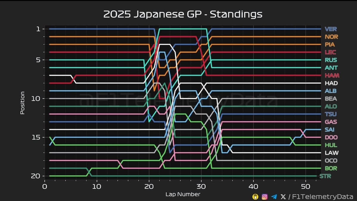 Hamilton managed to overtake Hadjar on lap 7. Hamilton was one of the few that opted to start on the Hard compound. Making positions on this tyre early on is great for the race. Tsunoda managed to overtake Lawson at the start. I was expecting that battle to be a lot feistier that it actually was, but it was pretty easy for Tsunoda.