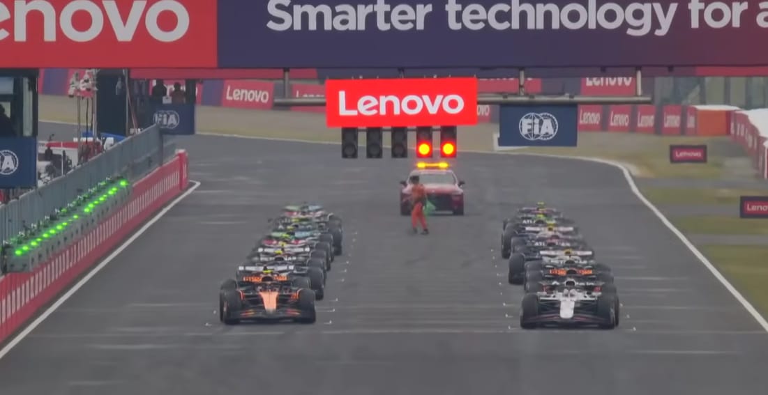 At the race start, Norris and Verstappen pointed their cars at each other. The Hunter and the Hunted, but Verstappen had a much better start and kept 1st place.