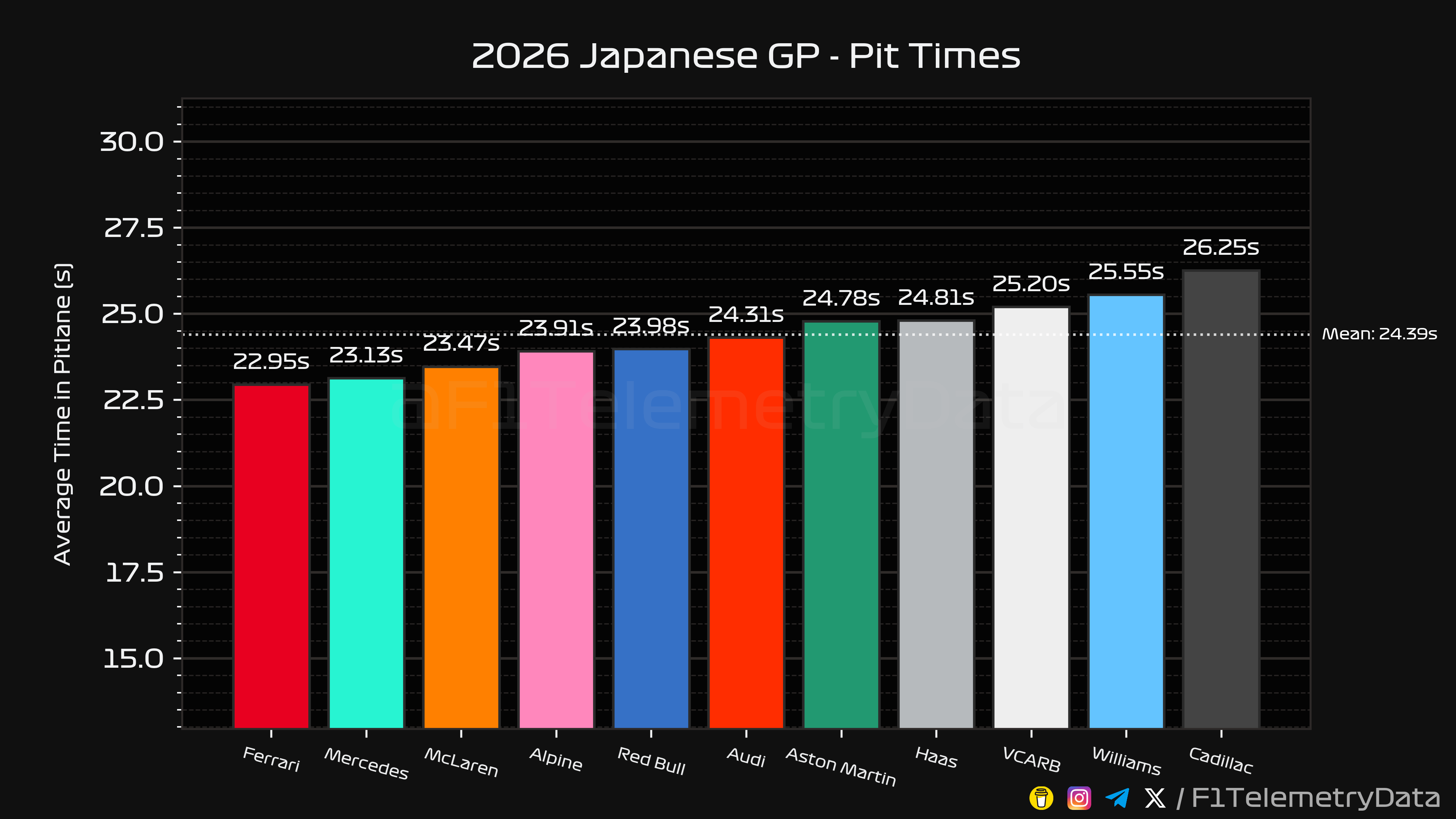 Further down, Audi (24.31s) and Aston Martin (24.78s) reflect teams still optimising their workflows, particularly with new power unit integrations and revised weight distributions affecting how cars settle in the box. The biggest concern remains with the newer entrants: Cadillac recorded the slowest average at 26.25 seconds, highlighting ongoing challenges with coordination and equipment under race pressure. With the grid average at 24.39 seconds, the spread is tightening compared to Australia and China, a sign that teams are rapidly learning. Suzuka, with its high-speed nature and limited overtaking, places a premium on pit precision, and Ferrari’s advantage here likely translated directly into track position gains.