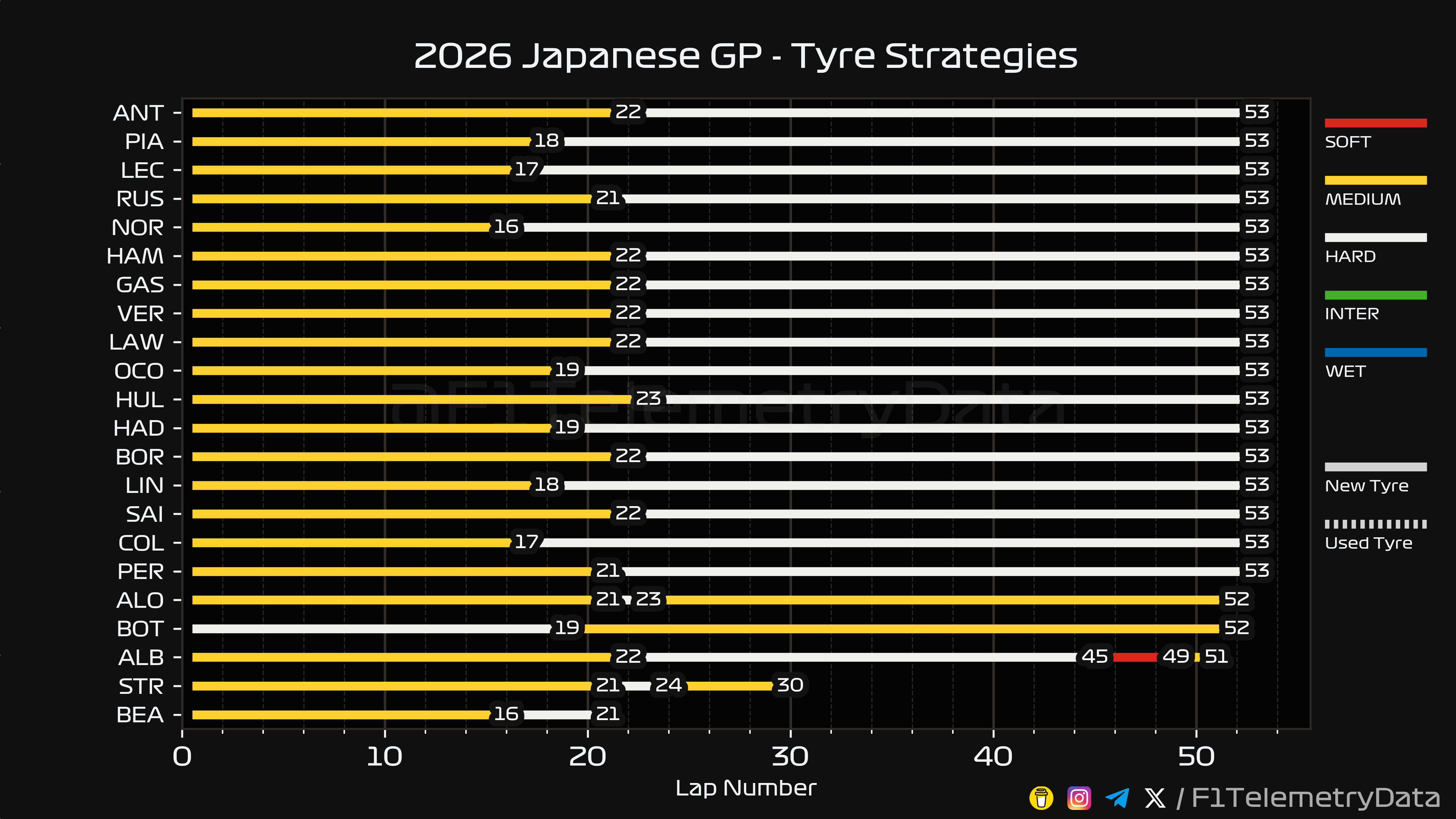 Suzuka produced one of the clearest strategic patterns of the early 2026 season, with the majority of the grid committing to a medium-to-hard one-stop strategy. Drivers such as Kimi Antonelli, Oscar Piastri, Charles Leclerc and George Russell all followed a similar approach, starting on mediums and extending into a long hard-tyre stint. This reflects both the improved durability of Pirelli’s 2026 compounds and the reduced thermal degradation caused by the new aerodynamic regulations, which place less sustained load through high-speed corners compared to previous years.